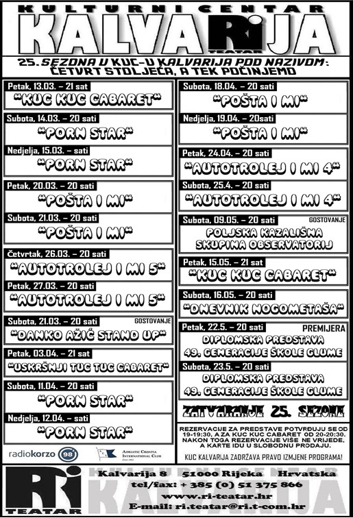 Kulturni centar Kalvarija donosi vam bogat program do kraja 25. sezone pod motom: “Četvrt stoljeća, a tek počinjemo”. Od kultnih kabarea i hit predstava poput “Porn Star” i “Autotrolej i mi”, pa sve do gostovanja i premijera novih generacija – na Kalvariji nema mjesta dosadi.